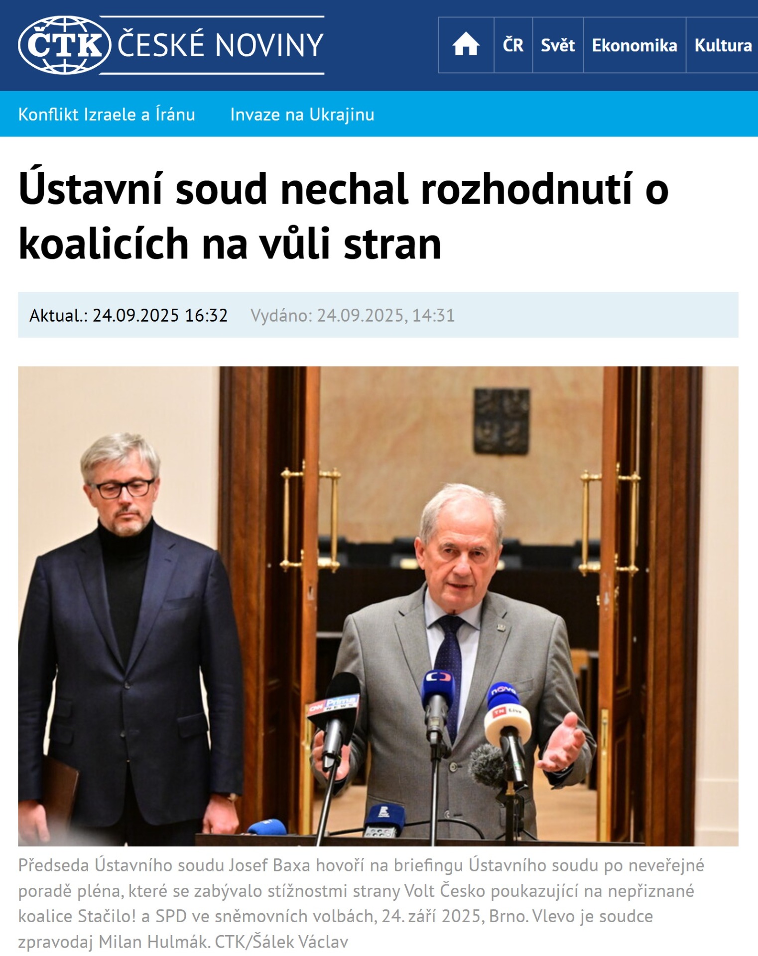 "Výsledkem dnešního odmítavého usnesení ÚS o stížnostech Volt Česko bude, že před příštími volbami do sněmovny dramaticky vzroste počet nepřiznaných koalic. Co dnes dělá Stačilo!, budou příště dělat všichni, protože se to smí," uvedl advokát Tomáš Nahodil. Soudu v nevyžádaném stanovisku navrhoval, aby stížnosti Volt Česko zamítl, ale zároveň...