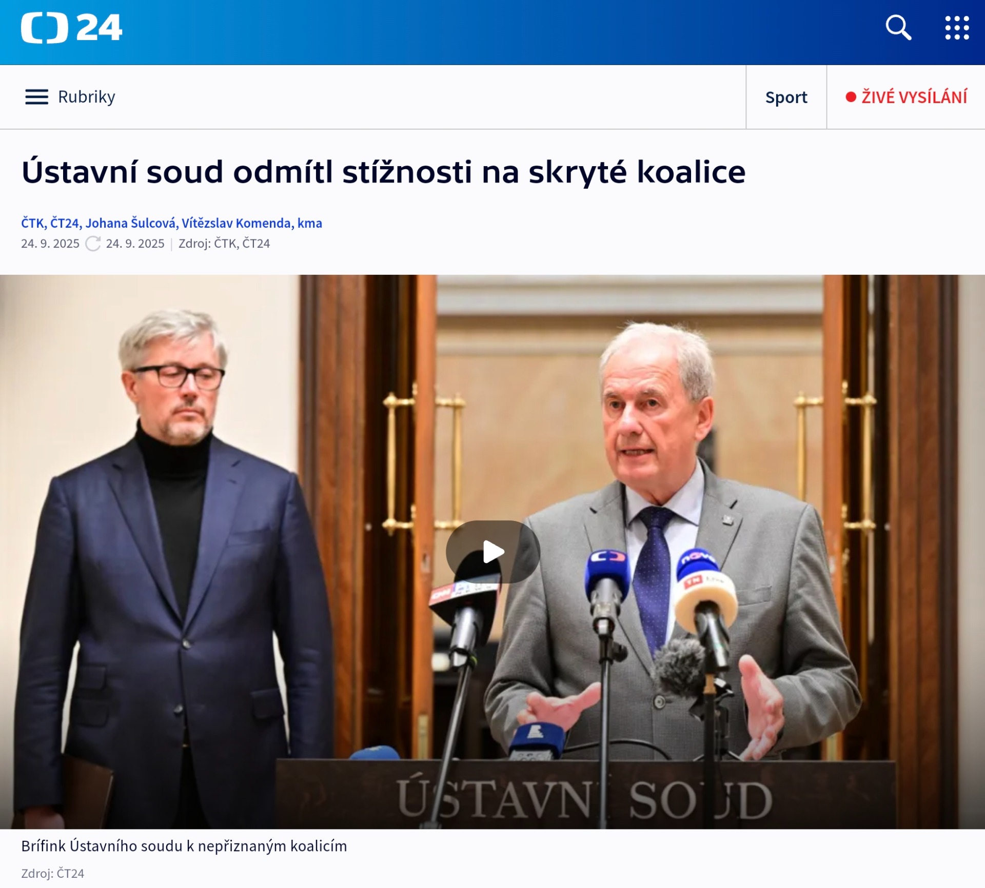 Zdroj: Kontinuální vysílání ČT24, Česká televize, 07.10.2025 (v čase od 22:30)