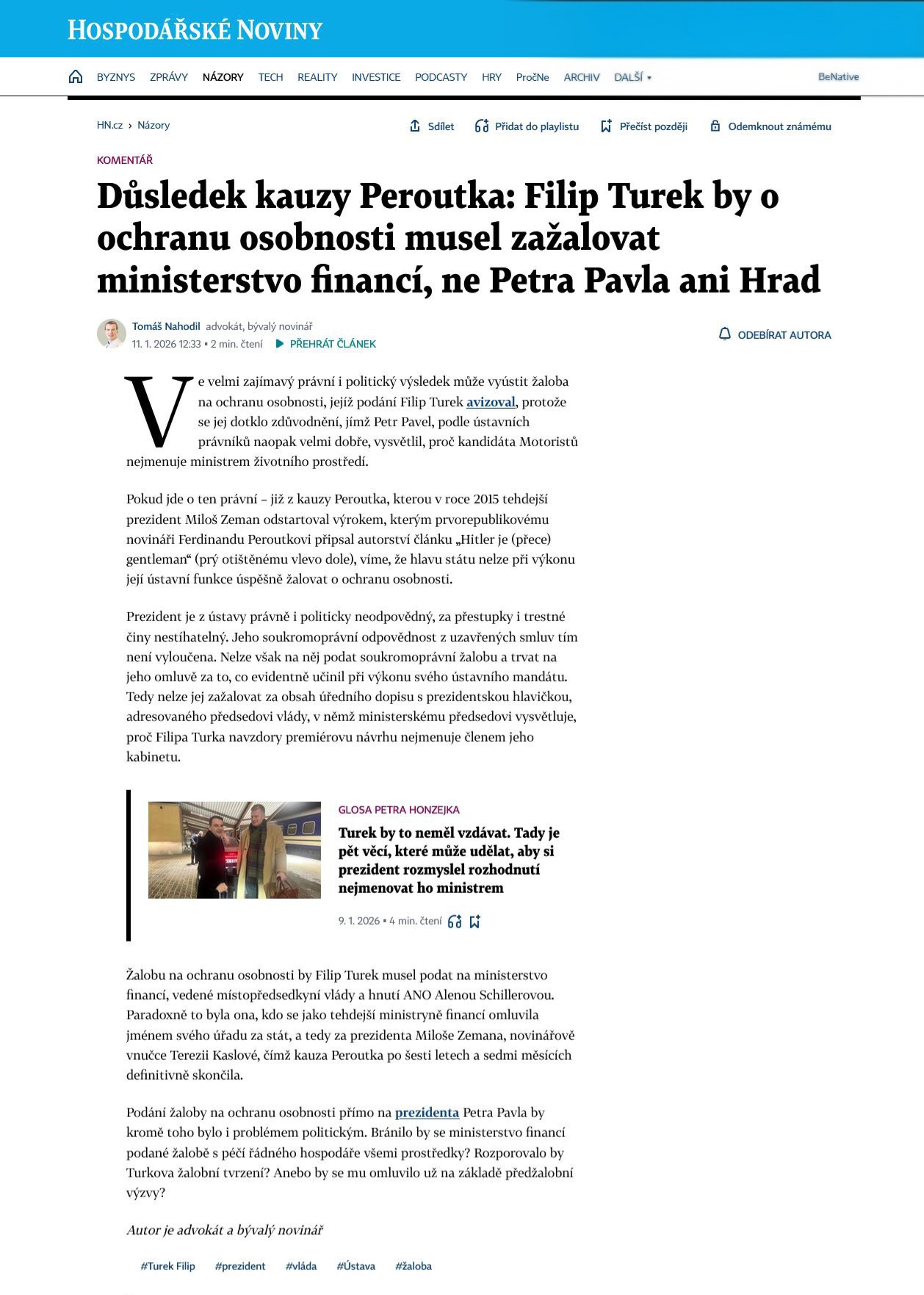 Zdroj: Při případné kompetenční "žalobě" bude mít Hrad výhodu; Tomáš Nahodil; Hospodářské noviny; 09.01.2026; str. 15